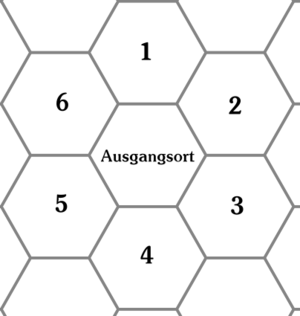 - Die Gruppe bestimmt die Marschrichtung und nutzt dafür die 6 Kardinalrichtungen der Hexfelder oder spricht direkt numerierte Hexfelder an